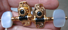 Here's an important note about Fustero tuning knobs. In my December 2004 shipment I requested and received 2 different "white" knobs from Fustero. One type is an imitation "mother of pearl" and the other is an imitation "bone" or "ivory". Please look at the photo below to see the difference between the 2 types of "white" knobs I received. I also continue to receive "black" knobs which look like horn. All 3 of these knobs are very strong and very attractive.