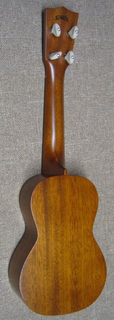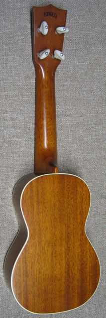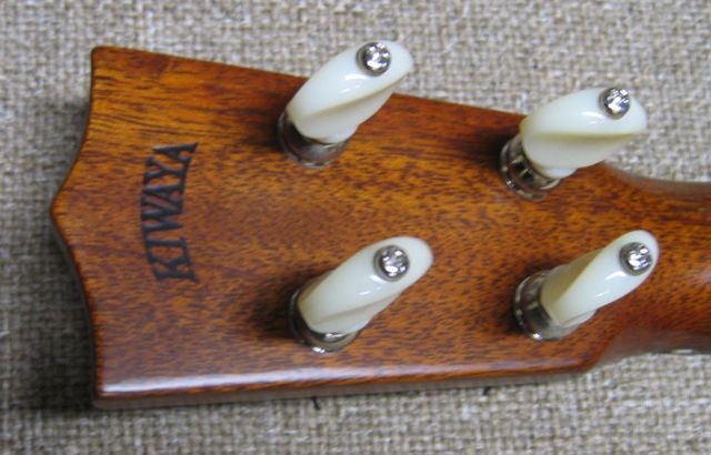 Above: Kiwaya Uke KTS-5, standard Soprano Size, 17 frets, Solid Mahogany, Indian Rosewood fingerboard, 7 larger dots on fretboard, 5 dots on fingerboard edge, Deluxe Nickel Plated Gotoh Tuners, 2 back braces, 2 harmonic face braces (one above and one below soundhole) and 2 fan struts under the face, real bone nut and compensated bone saddle, List price is $775 (in stock as of December 1, 2020). Call for price, I do not quote by email.