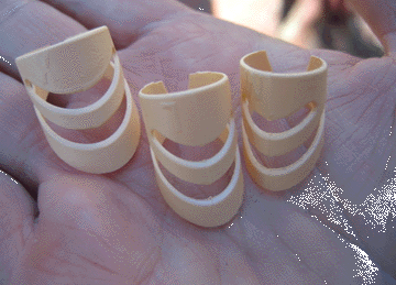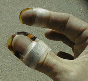 Index finger and thumb unhas of rigid white vinyl (top 2 unhas), tortoise shell plastic unhas (index and thumb) made of pick guard material with surgical tape attached (bottom 2 unhas)