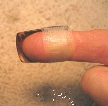 Plastic "tortoise shell" unhas affixed with surgical tape