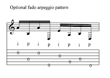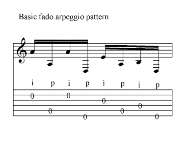 The first exercise presents the basic fado arpeggio accompaniment. It is an alternating pattern using the index finger and thumb. It begins with the index finger playing free-stroke, the second note is played by the thumb--usually the thumb note is played rest-stroke.The pattern continues with this alternating pattern of index and thumb. Some players play free-strokes with the thumb, however, the rest-stroke really emphasizes the note. Play this pattern until you can do it unconsciously.