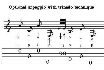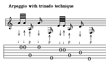 Next is an exercise using the trinado embellishment. In this exercise, up and down strokes are used by the index finger which is playing free-strokes.