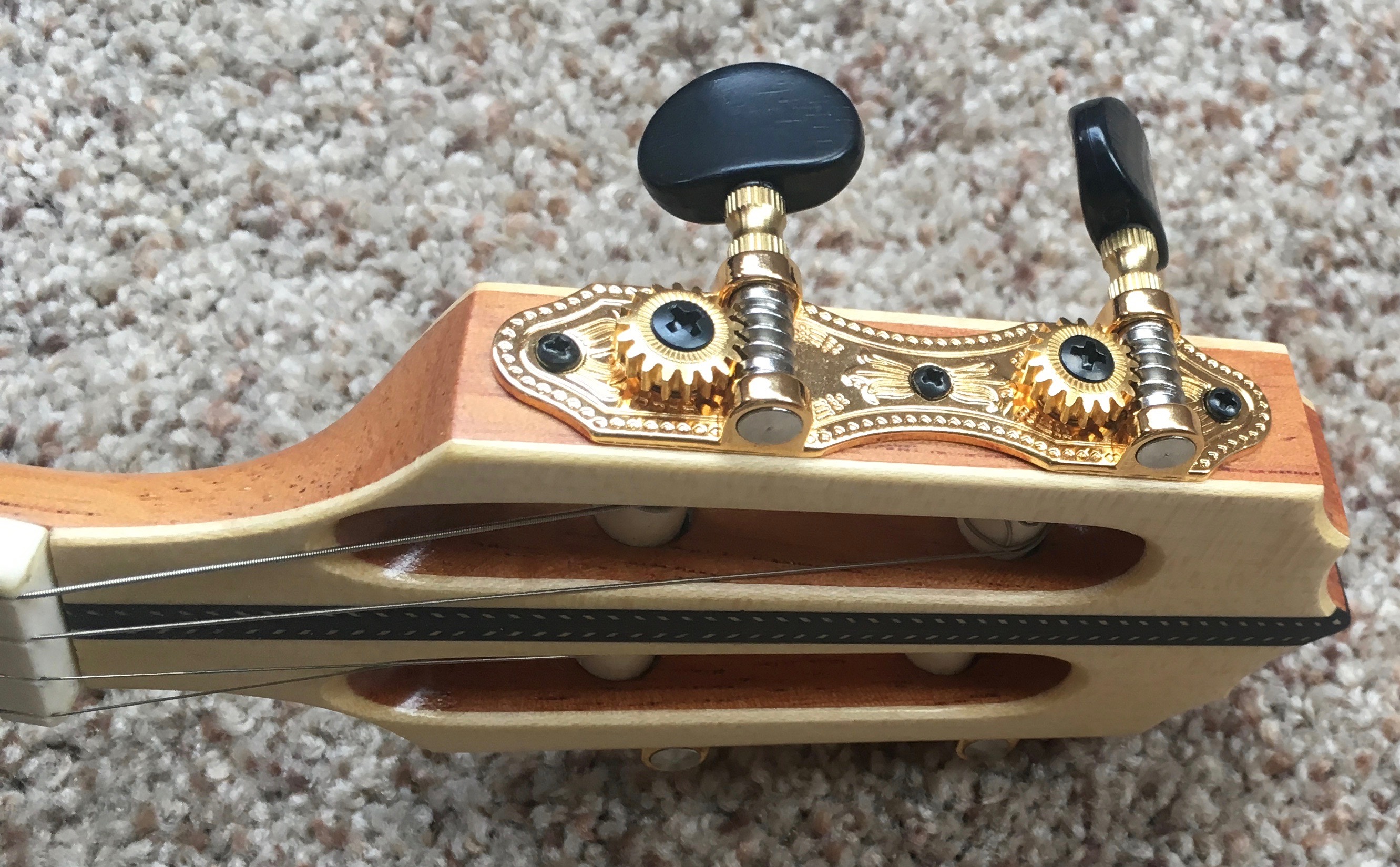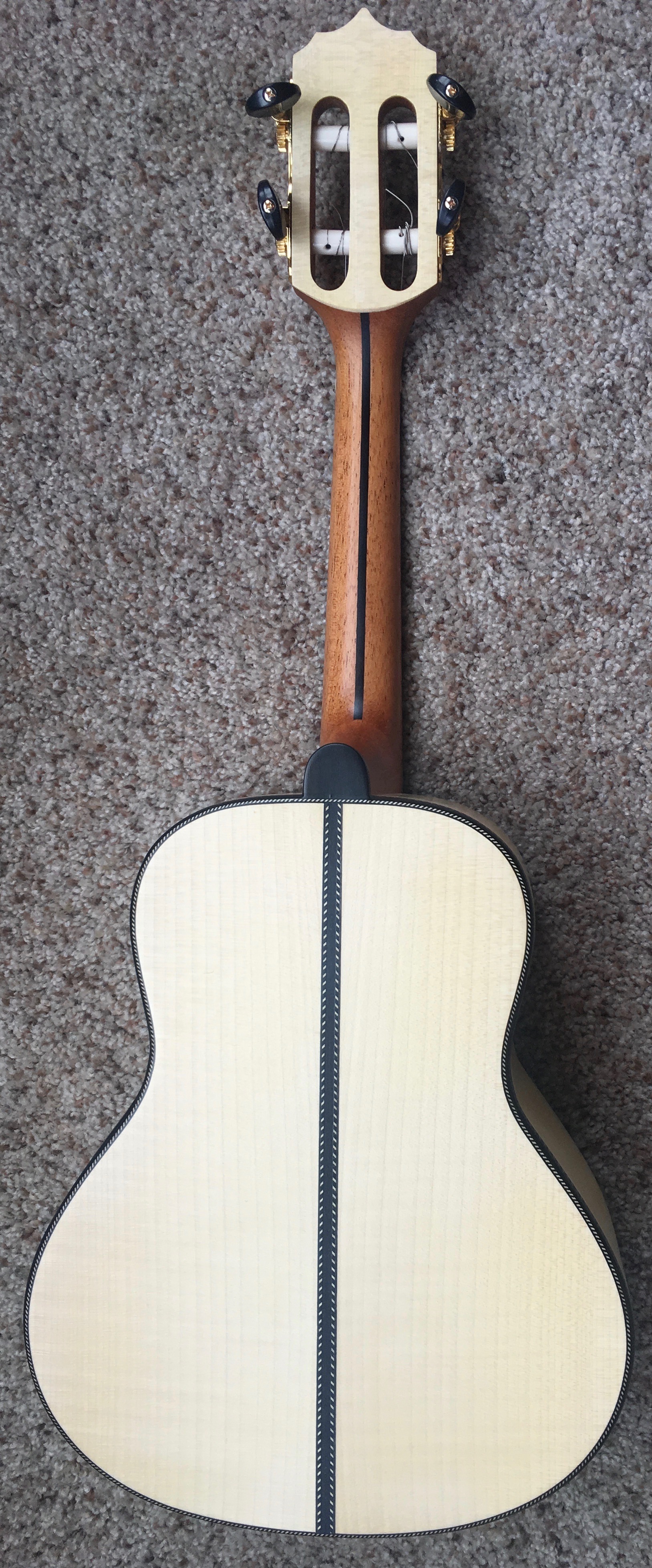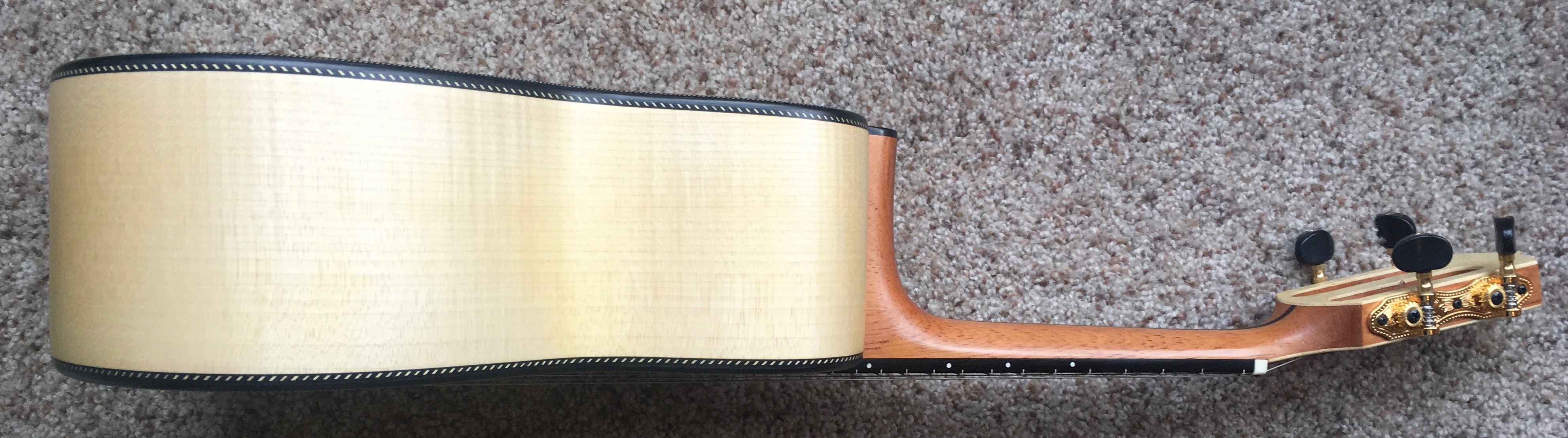 This instrument has a solid spruce face, solid back and sides of Faia (also spelt Faya) and ebony fingerboard.