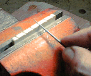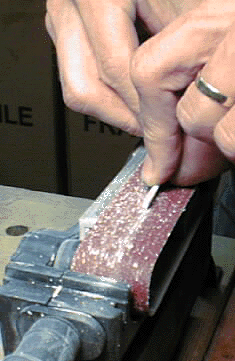 Next I file the fret edges on an angle with a smaller file covered with 120 grit sandpaper.