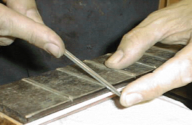 Next, I use a triangle file, the edges of which have been smoothed to prevent damage to the fingerboard. With this file I smooth and round the edge of the fret.