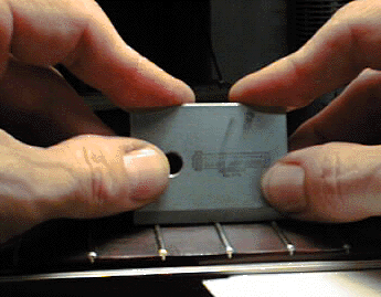 Then, I begin checking the levelness of the frets. This is done with a 3" metal straight edge ruler on the first 9 frets and a 2" straight edge ruler on the higher frets (see the 2" ruler being used in photo below). The procedure is simple but very important. You place the straight edge on 3 frets at a time to find out if any of them are high. To feel whether any fret is high you must hold the straight edged ruler on the corners and evenly press down. If the ruler "rocks" then you have found a high fret. It is necessary to check the levelness under each of the 6 strings all the way up the neck. While guitar factories do a pretty good job at installing the frets in a level manner I nearly always find a few which are slightly high. I have perfomed this procedure on thousands of guitars made all over the world and I continually find high frets on both production guitars and handmade instruments from famous builders.