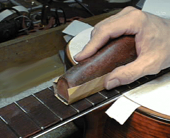 Using a small metal fret guard to protect the fingerboard, I sand each fret with 320 grit sandpaper which I wrap around a rubber eraser.