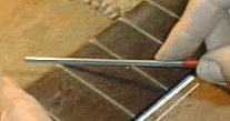 Then, I use 2 different diamond faced fret "crowning" files (150 and 300 grit) to put a smoothly round or "crown" on the top of the fret.