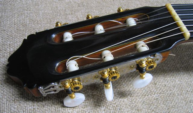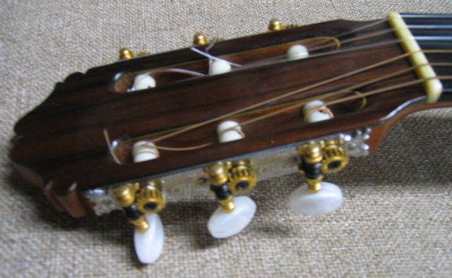 My friend, Pepe Rodriguez, told me that he and his family had made so many guitars that he knew what the guitar would sound like in his mind before the soundbox was closed up. He also told me (half-jokingly?), that he would breathe some spiritual essence into the guitar before the soundbox was closed up (this is a charming image) in hope that it would sound good. In 1967 I was attending a summer course at the University of Madrid and I went down to Cordoba to pick-up the flamenco guitar I have ordered from Miguel Rodriguez. At that time my father was involved in the guitar business and he would purchase guitars for export from various good makers including Miguel Rodriguez. During the 3 days of my visit the grandfather was completing my guitar and I would be taken around Corboba by Pepe (a great guitarist and the grandson apprentice in the family business). There were a number of memorial moments during this trip for me. One was Pepe taking me to a quite small plaza where he told me that he came for inspiration for his musical composition (a few years later Pepe wound up teaching guitar at the conservatory in Cordoba in addition to making guitars at the shop). Another moment was when we went to copy ancient mosiac design from Moorish building onto graph paper with colored pencils. At night, Pepe took me to a small garden restaurant where a flamenco guitarist and singer were performing, when the performers saw Pepe they invited him to play a solo--obviously he was very respected. On that same night, I remember that we were with his cousin (the son of Rafael Rodriguez) and we three walked in unison and Pepe taught me to clap syncopated flamenco rhythms to the sound of our foot steps. And, one special moment I strongly remember was holding my new guitar down on the work bench as Miguel Rodriguez (the grandfather), took out a metal die and pounded his name with a big hammer into the back of the lower part of the head--this little episode scared me--I thought he would break the head.